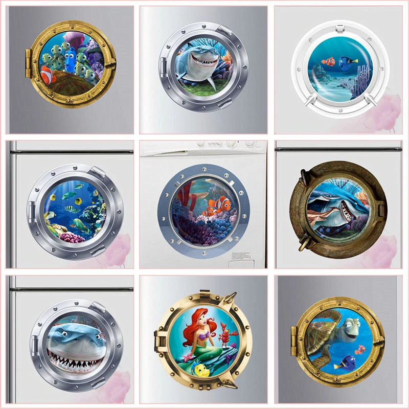 Limited Price for 3d Smiling Big Shark Nemo Dory Submarine Portholes Windows Wall Stickers For Washing Machine Decora
